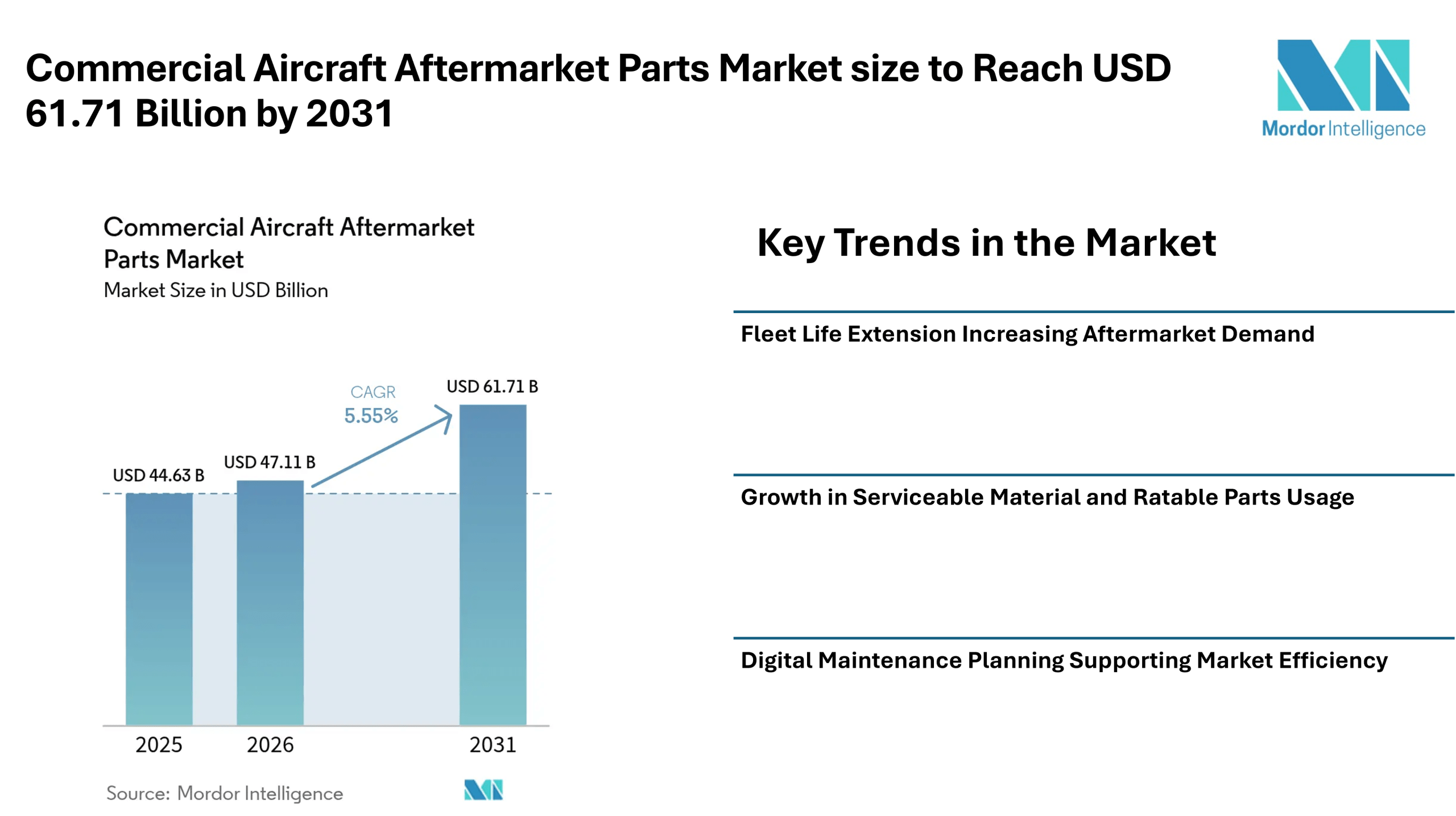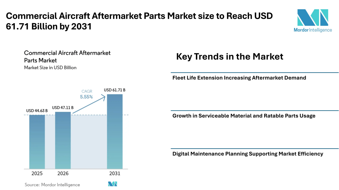 Home Press Releases Commercial Aircraft Aftermarket Parts Market size to Reach USD 61.71 Billion by 2031 as Fleet Life Extension and Predictive Maintenance Influence Market Trends – Mordor Intelligence