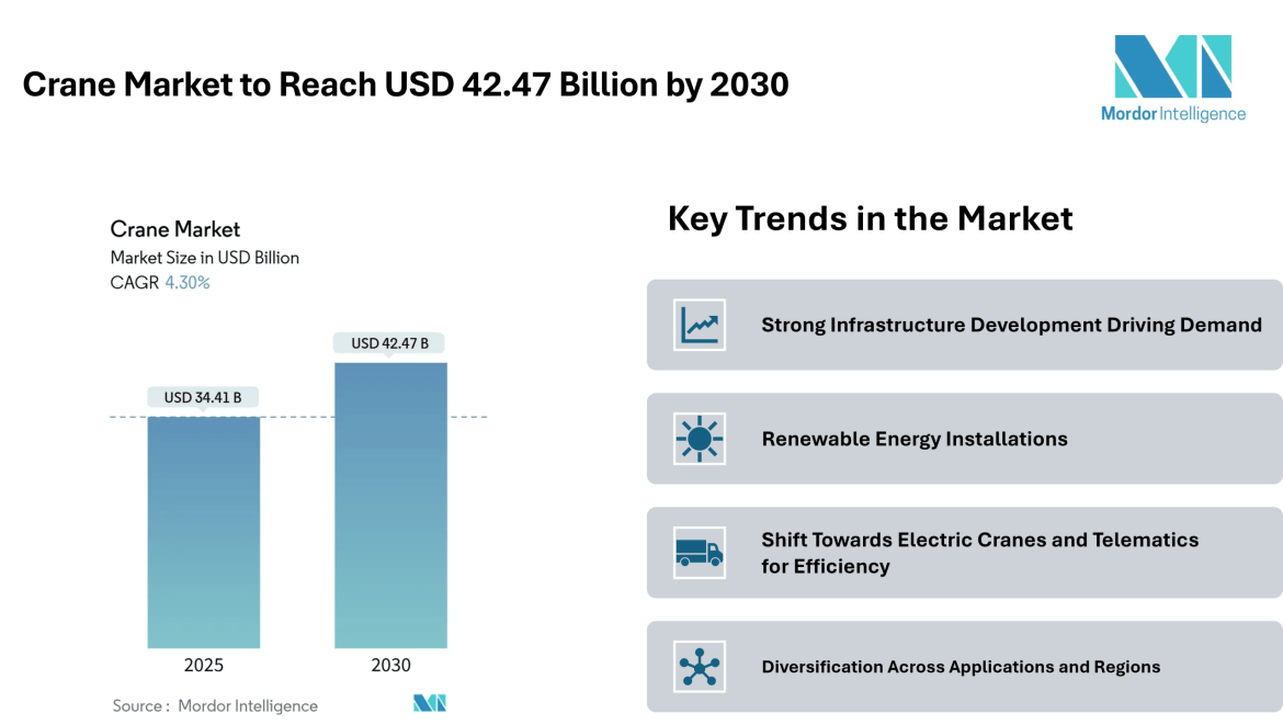 The crane market reached USD 34.41 billion in 2025 and is projected to advance to USD 42.47 billion by 2030, translating into a 4.30% CAGR. This growth is underpinned by a variety of factors, including increased public infrastructure spending, large-scale private megaprojects, and a growing emphasis on renewable energy installations. As the world navigates evolving construction needs and energy transitions, the demand for versatile, high capacity lifting equipment continues to rise.