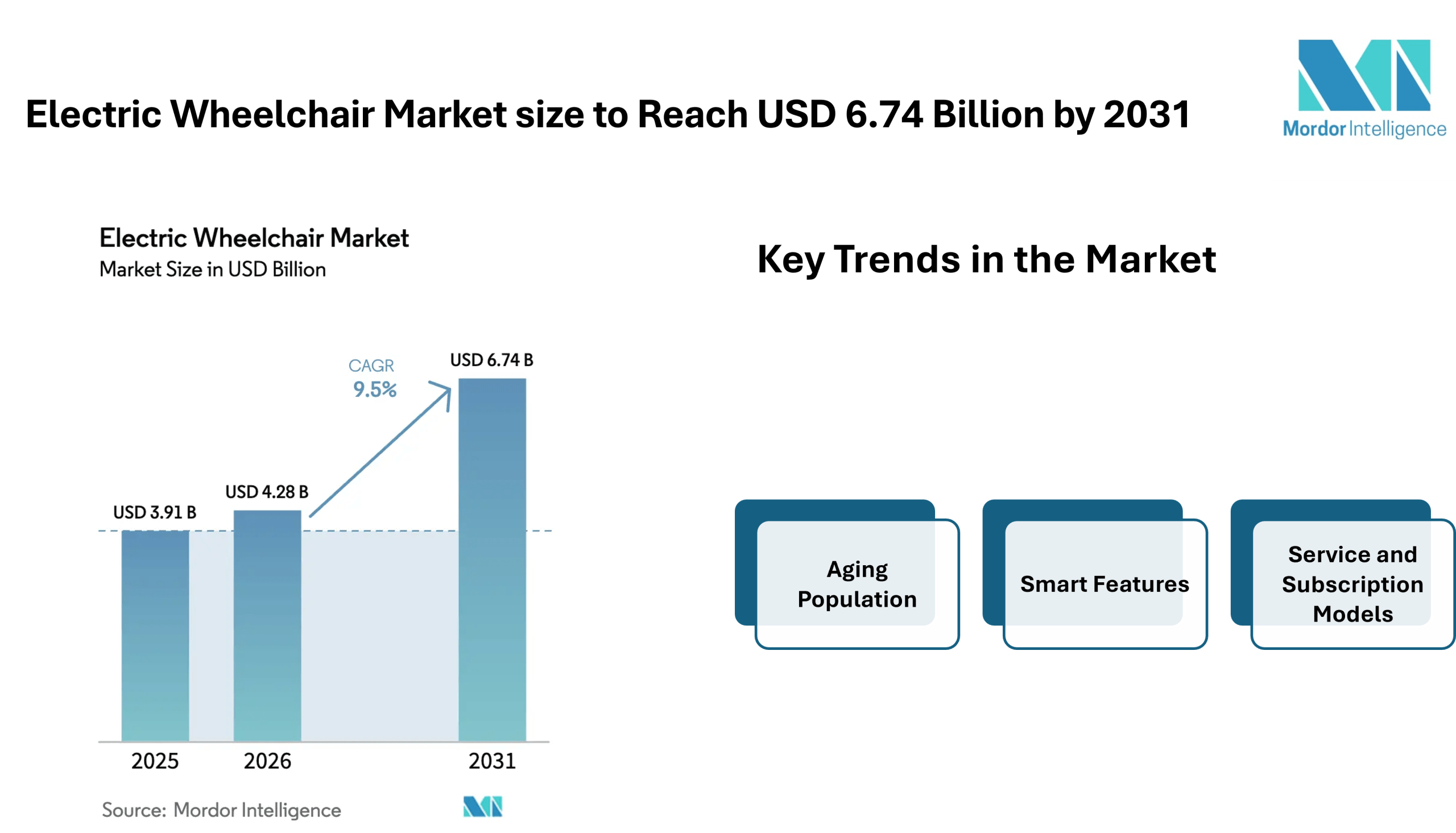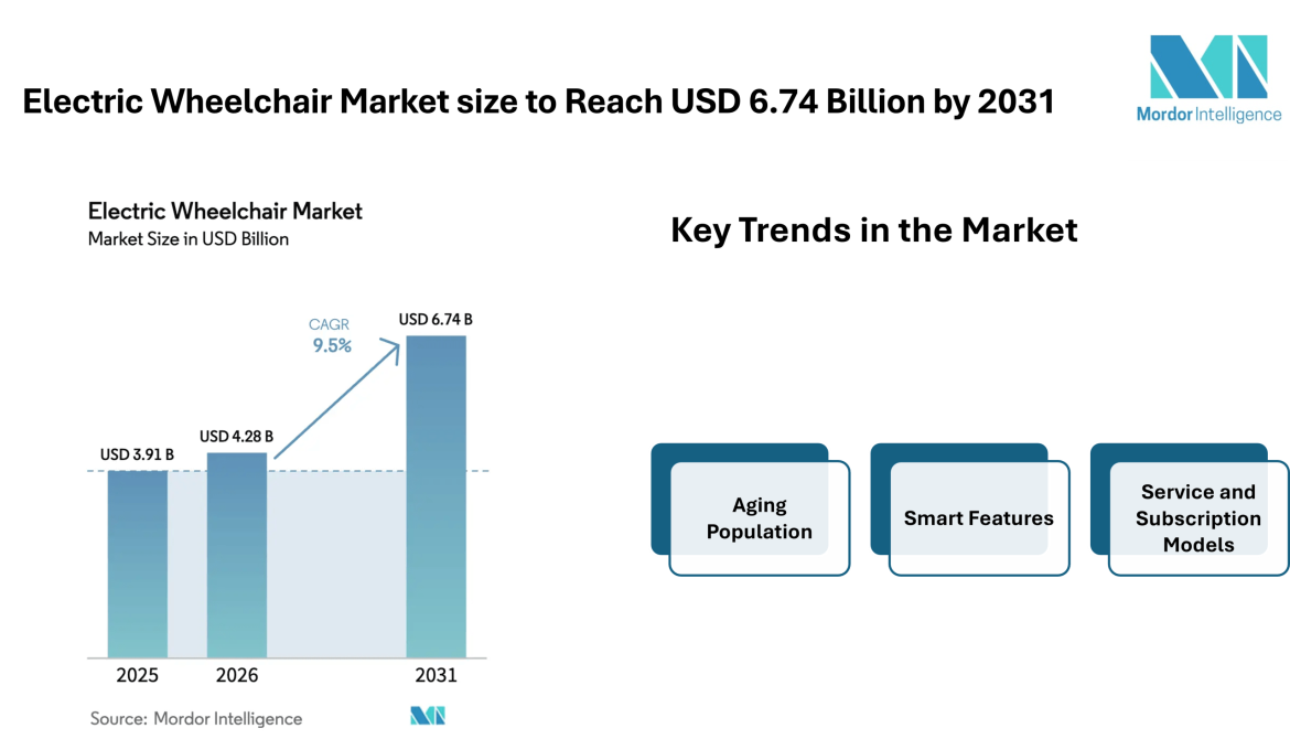 According to Mordor Intelligence, the electric wheelchair market size is estimated at USD 4.28 billion in 2026, rising from USD 3.91 billion in 2025, and is projected to reach USD 6.74 billion by 2031, reflecting a steady expansion with a 9.5% CAGR during the forecast period. These figures highlight the steady electric wheelchair market growth supported by demographic changes, healthcare needs, and improvements in assistive mobility equipment.
