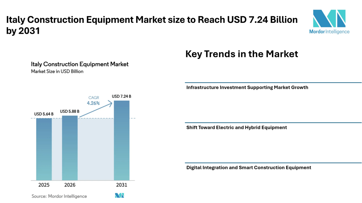 Home Press Releases Italy Construction Equipment Market size to Reach USD 7.24 Billion by 2031 Driven by Infrastructure Spending, Green Equipment Demand, and Digital Construction Practices – Mordor Intelligence