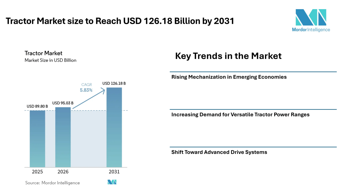 Home Press Releases Tractor Market size to Reach USD 126.18 Billion by 2031 from USD 95.03 Billion in 2026, Driven by Mechanization Demand – Mordor Intelligence