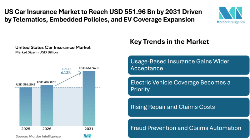 According to Mordor Intelligence, the United States car insurance market was valued at USD 386.2 billion in 2025 and is estimated to grow from USD 409.87 billion in 2026 to USD 551.96 billion by 2031, growing at a CAGR of 6.13% during 2026–2031. Strong premium momentum has followed significant rate adjustments in recent years, alongside stricter liability requirements in several states that expanded the insurable population. At the same time, digital purchasing habits among younger drivers, usage-based policies, and coverage tailored for electric and semi-autonomous vehicles are sustaining long-term demand across the United States car insurance industry.